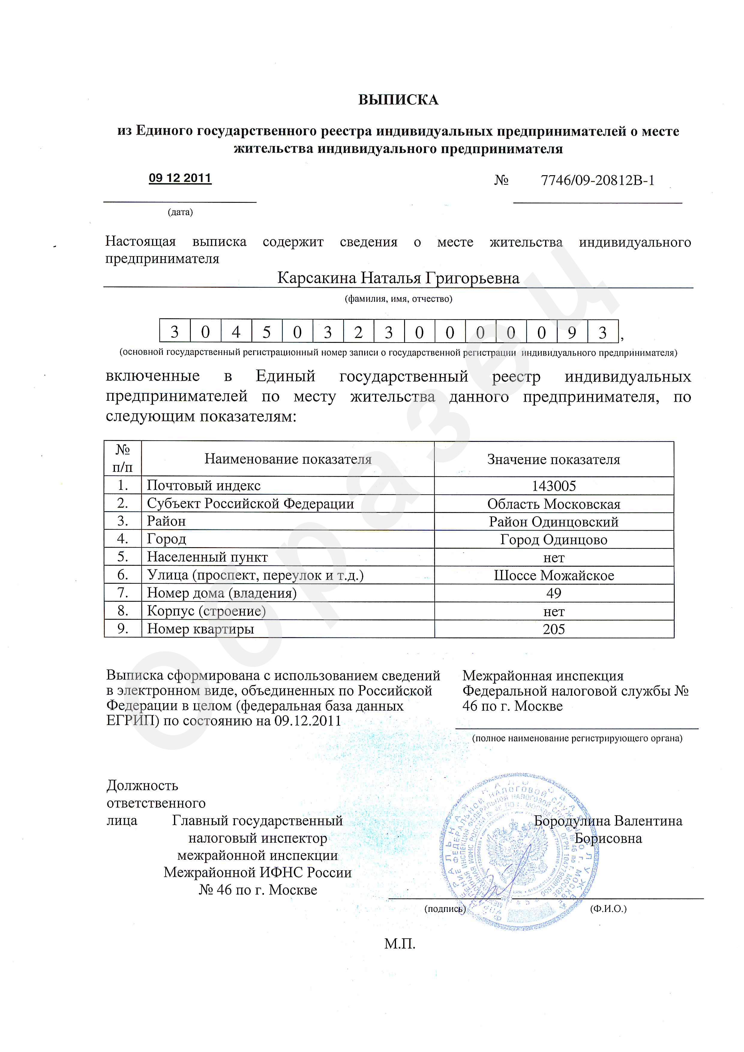 Выписка из ЕГРИП о месте жительства индивидуального предпринимателя - документ, содержащий в себе сведения об адресе регистрации индивидуального предпринимателя, полученные из Единого государственного реестра индивидуальных предпринимателей.